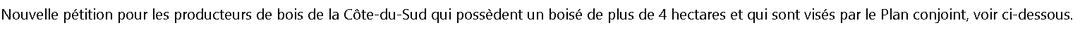 Cette pétition s’adresse exclusivement aux producteurs de bois de la Côte-du-Sud qui possèdent un boisé de plus de 4 hectares et qui sont visés par le Plan conjoint des producteurs de bois de cette région.